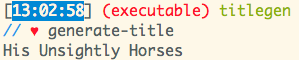 Now, when we run ruby bin/generate_title from the command line, inside the directory of this project, we will see a brand-new title: