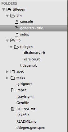 The lib directory contains the titlegen.rb file, which contains the main functionality of our gem. That file requires files in the lib/titlegen subdirectory, notably the dictionary.rb file which contains the Dictionary module.