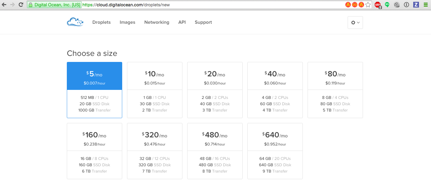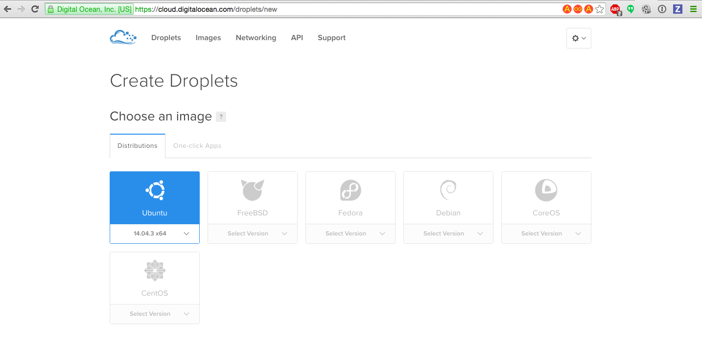 Once you sign up for your DO account, click the "create droplet" button. Create a new droplet with an Ubuntu installation: