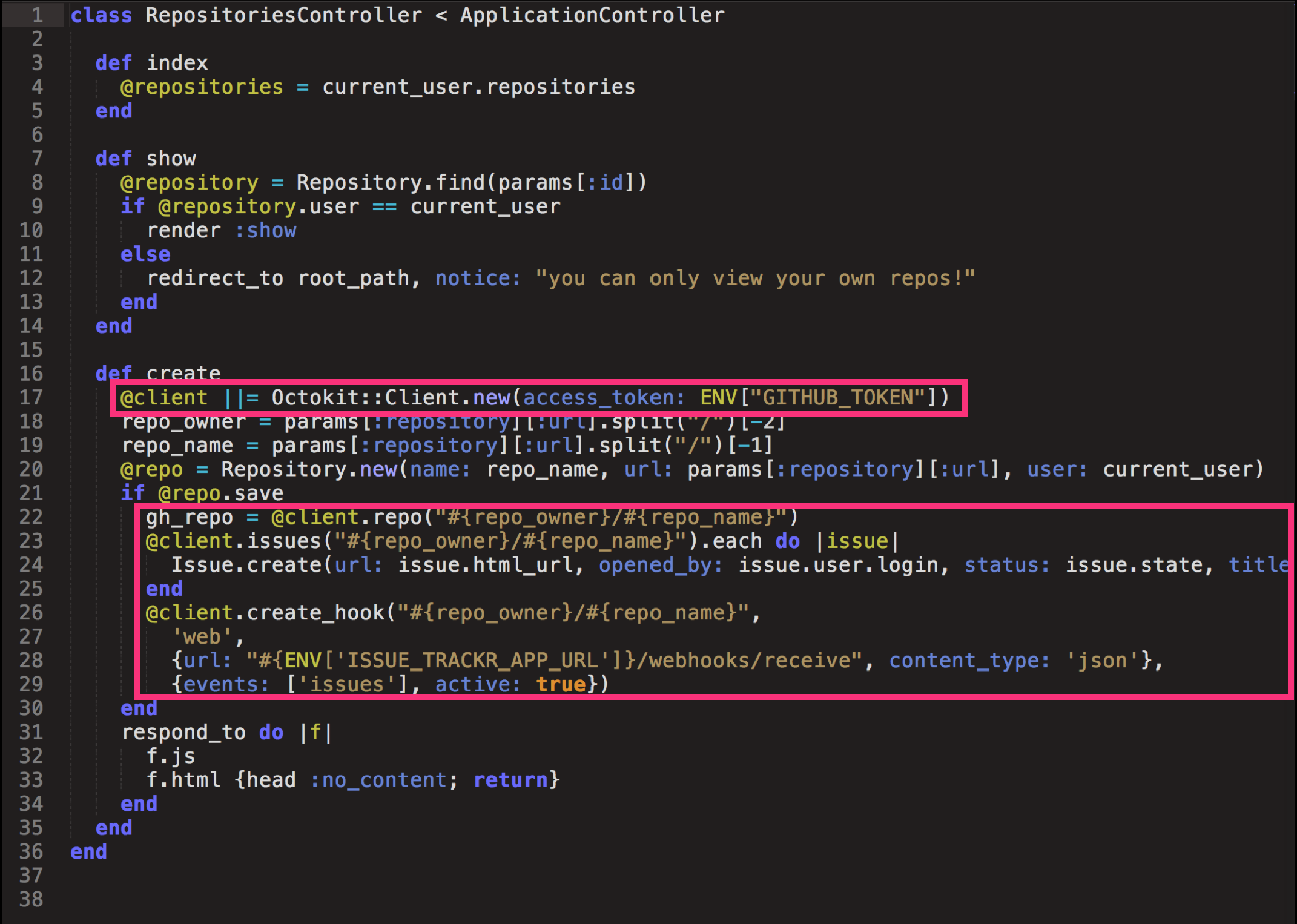 In this application, once a new repository is created (by a user filling out the form for a new repo and clicking "submit"), we use an Octokit client to request that repo's issues from GitHub, and to add a webhook to that repo.