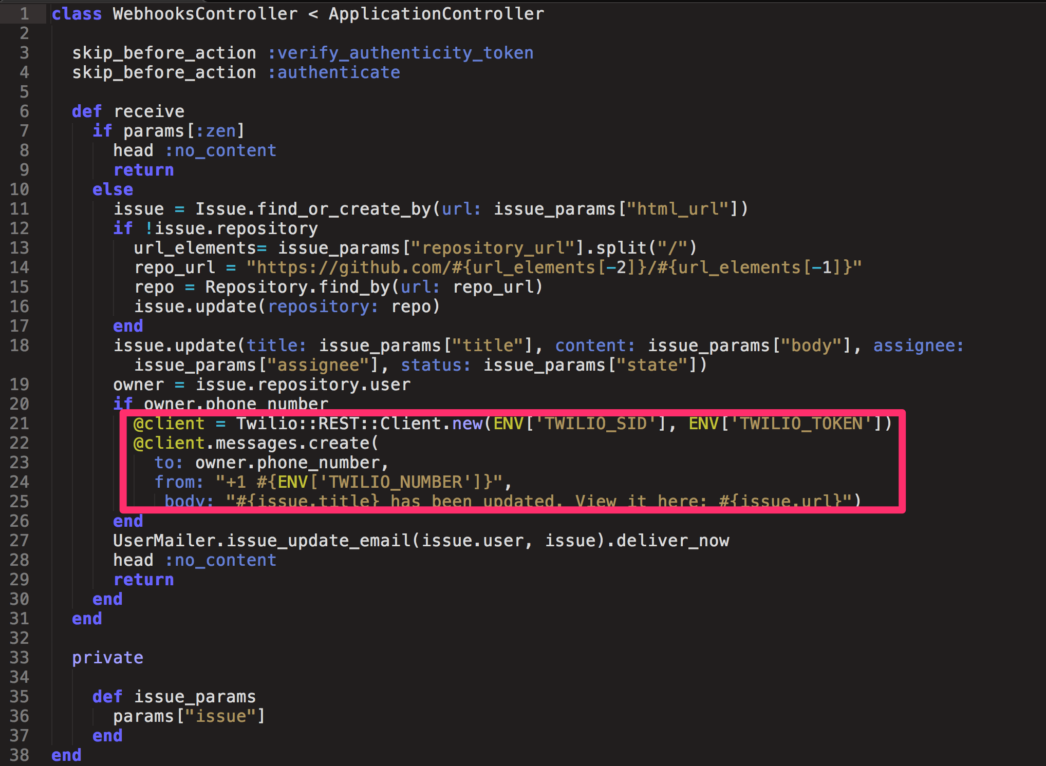 Our Twilio code lives in the WebhooksController. The app sends a text message update to the user every time a webhooked repository sends a payload to the app describing a new or updated issue.