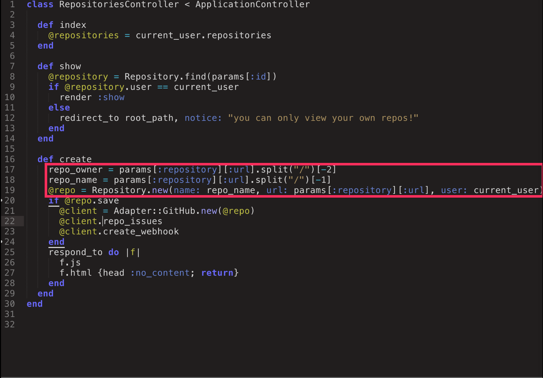 Here we can see that we have to do some string manipulation on our params in order to extract the data we need to create and save a new Repository record.