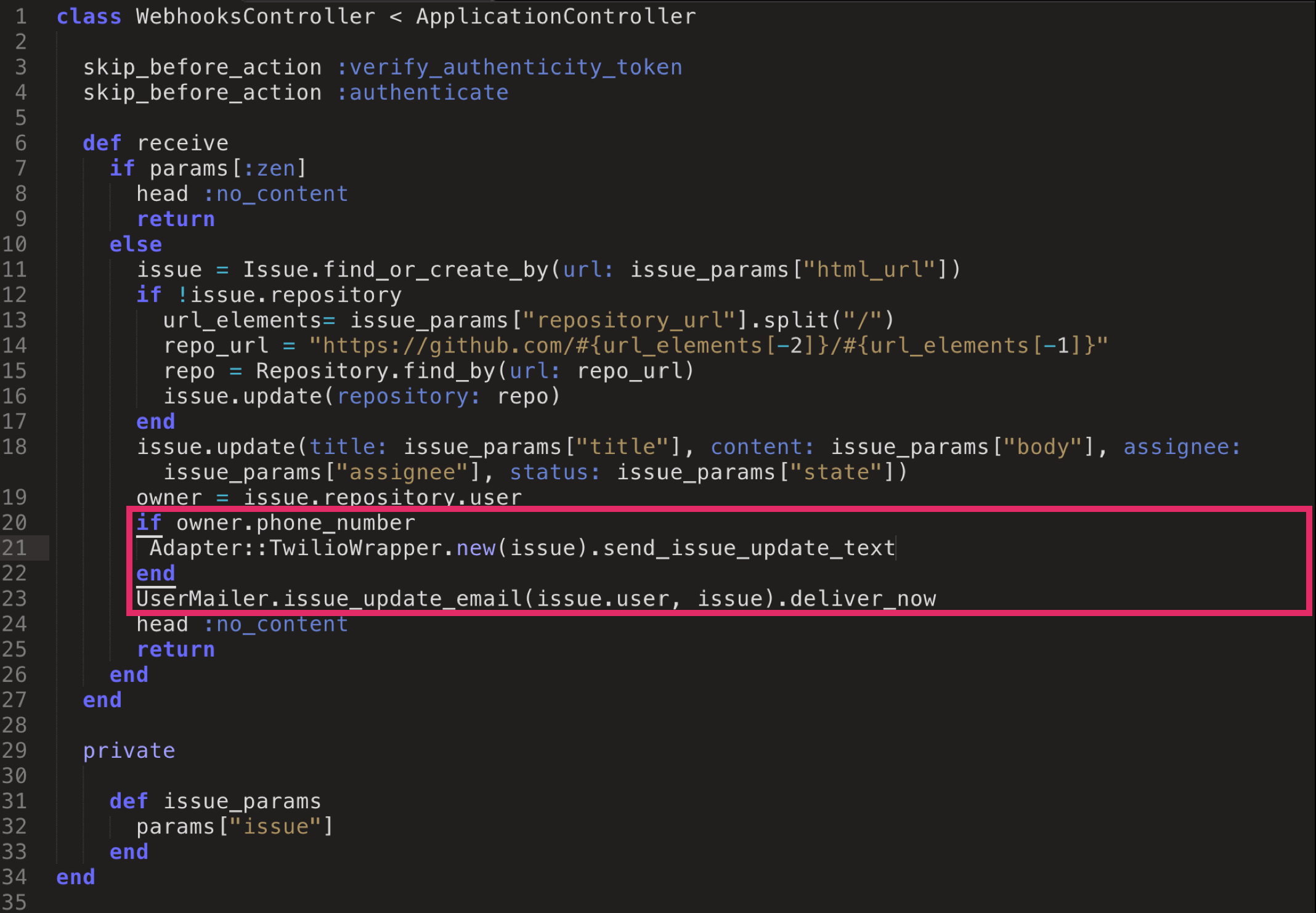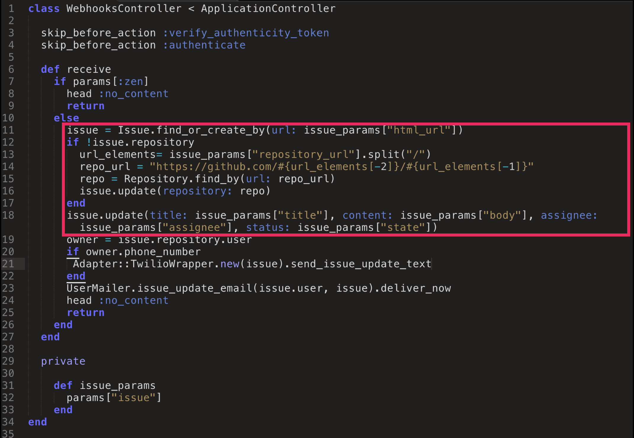 We'll also define a helper method, #update_issue_repo, to handle the job of finding or updating the issue's repository (in this app, an issue belongs to a repository and a repository has many issues). That is really a separate job that needs to occur in order for an issue to be properly updated.