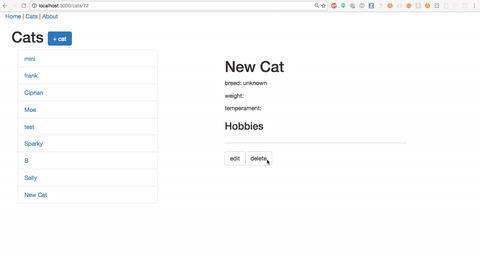 Our user should be able to delete a cat by clicking a "delete" button displayed alongside the cat's details. This should remove the cat from the DOM and redirect the user back to the cats index view. Something like this: