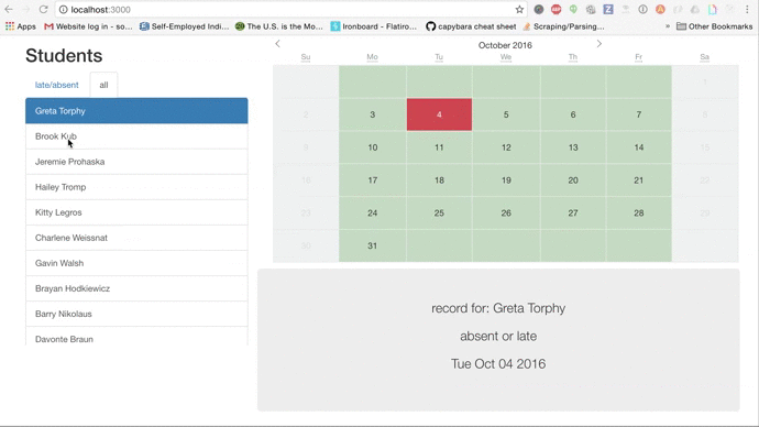 Now that we have our student list up and running and displaying a lovely list of students, we need to allow our user to click on a student from that list, make that student the "selected student", and display that student's attendance record for the selected day.