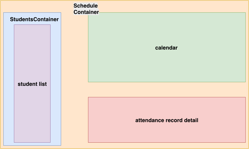 So, we'll build a container components, ScheduleContainer, that contains the child presentational components of calendar and attendance record show. We'll make a StudentsContainer component that is rendered by ScheduleContainer but that in turn renders a presentational component, StudentList.